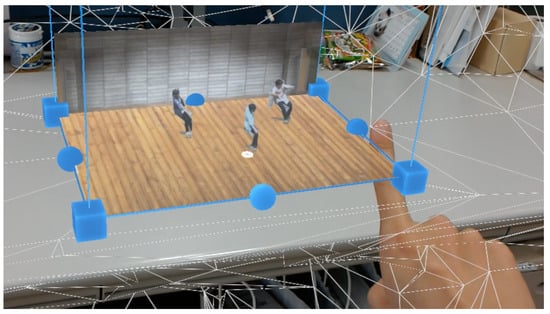Given that the content consists of a minimal number of polygons, rendering and producing multiple textures and polygons in 30 fps even using a standalone MR HMD, which has limited processing power, is possible. The user can enjoy the MR content while changing their position and viewpoints freely, and the content can be placed or resized in the real world through user gestures, as shown in Figure 7.