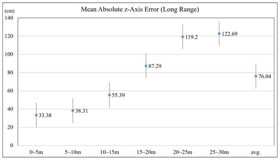 At a distance of less than 20 m, depth errors were less than 1 m. As shown in Figure 9, the error increased as the model moved away from the camera because as the distance of the ground truth image increases, the number of pixels that represent the same distance decreases. Thus, the error increases as the quantization error increases.