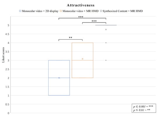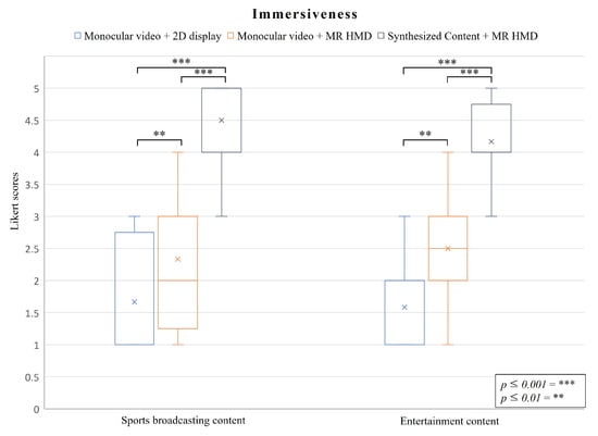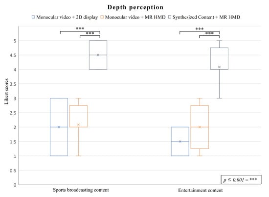 First, we performed the Friedman test [] for multiple comparisons to assess the differences between the group means in the experimental results. As presented in Table 3, the test result shows a significant difference in the subject’s assessment depending on the method. We conducted the Wilcoxon signed-rank test [] as post hoc analysis to identify which factors have a significant difference, and the result is illustrated in Figure 12. In order to verify whether the randomization controls order effects, the two-way ANOVA test [] was used to check whether there were significant differences in assessment results between the ordering groups. The ANOVA test shows p-value = 0.163 for sports broadcasting and p-value = 0.589 for entertainment content, which means that the randomization works well because no significant differences were detected across the ordering conditions.