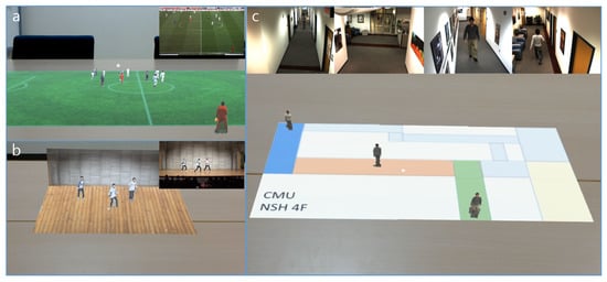 Research on how to view the generated free-viewpoint videos has been conducted. Before the development of the HMD, the user controls the viewpoint of the generated free-viewpoint videos through the primary input interface, such as a keyboard, mouse, and joystick. In order to improve the usability of these non-intuitive methods, interactive systems that control the viewpoint using markers [] and multi-touch gestures [] have been proposed. With the advancement of HMD technology, Inamoto proposed an early-type interactive MR system [] that displays a free-viewpoint video in the real-world using a video see-through HMD, and the system proposed by Rematas et al. [] can intuitively change the viewpoint in a free-viewpoint video using a MR HMD.
