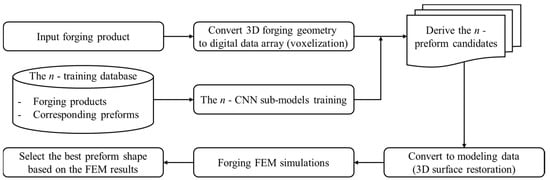 A flowchart of the CNN-based preform design model is presented in Figure 1. The training database consisted of forging products and relevant preform shapes. The training materials should be designed to satisfy design requirements without user bias to eliminate the limitations that appeared in the literature survey. The product geometry was converted into a 3D digital data array (voxel array), and the preform candidates were derived from the various trained CNN models. The derived 3D data arrays of the preform candidates were converted into 3D modeling geometries. To select the best preform among the candidates, each candidate was evaluated by a finite element method (FEM) simulation. Based on the FEM results, one shape was easily selected as the preform that satisfied the design requirements of the input forging product.