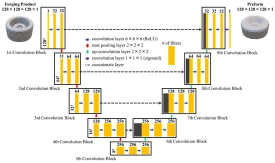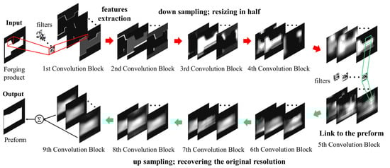 The array is reduced in half the size of by the red arrows in Figure 2 which represent a max-pooling operation. After that, by doubling the number of filter arrays, the features recognized in the previous convolution block are “zoomed in”. After the 4th convolution block, the size of the considered image is increased to derive the preform shape in the original dimensional scale. In this upgoing sampling procedure following the green arrows, the feature maps are mapped to the considered preform design, starting from small features (convolution block 5) to large features (convolution block 9). By concatenating the number of features in the down-sampling and the up-sampling operation, any loss of information concerning the positions of the feature positions in both the forging and preform shapes is avoided.