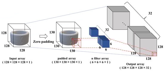 The voxel array input to each layer is (h · w · d · c). h, w, and d are the height, width and depth of the array, respectively, and c is the number of channels that signifies the information of the array. The convolution operation is conducted as the filters move in the h, w, and d directions of the input array. In this study, 128 voxels were considered for the h, w, and d values in the voxel array of the 3D forging and preform geometries through the conversion processes, summarized in Appendix A. For the filter array, six voxels for each of the three axes were considered. Those values are the trade-off for the training convergence and computational efficiency.