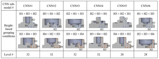 According to the defined grouping criterion in Figure 7, one forging shape may belong to one single group or two different groups, resulting in each group having either 28 or 32 levels. The subdivision of the database was utilized for six CNN sub-models, all with the same CNN architecture. Six preform candidates were derived for an inputted forging shape according to each sub-model and further evaluated through FEM simulations to select the best preform that reduces the forging loads and avoids forging defects.