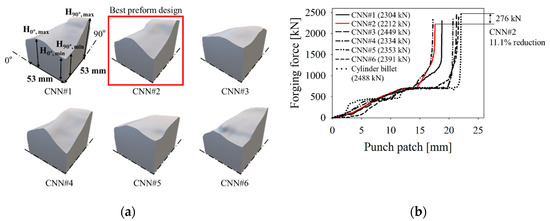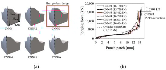Considering the first approach, the six shapes of the preform candidates are shown in Figure 12a and Table 3 and the preform shape derived by CNN#2 ensured the highest forging load reduction of 11.1% compared with that of a cylindrical billet (Figure 12b). The FEM results presented in this section were acquired through a 3D thermo-mechanical FEM model, as described in Appendix B.