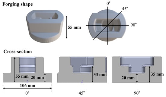 The1/4 plane-symmetric forging with cross-sections along 0°, 45°, and 90° directions.