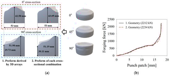 (a) Preform geometries for the symmetric forging and (b) forging force–punch patch comparison.