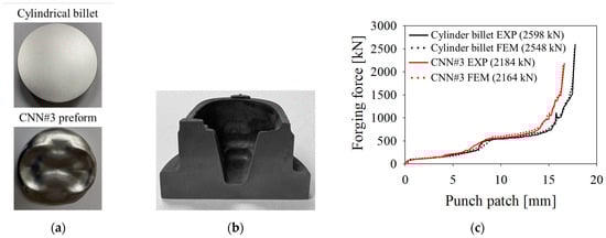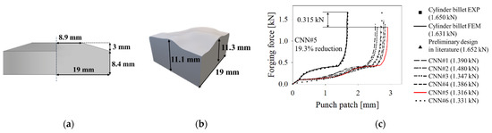 As shown in Figure 16, all six preform shapes allowed a maximum forging load reduction in comparison with the cylindrical preform, and the maximum reduction was identified for the preform shape derived by the CNN#5 sub-model. In Figure 16c, the comparison between the experimental results [26] and the authors’ FEM model results for the cylindrical billet show a particularly good agreement, proving the reliability of the implemented FEM model. However, the preform design derived by the proposed methodology reduced the forging load and eliminated forging defects.