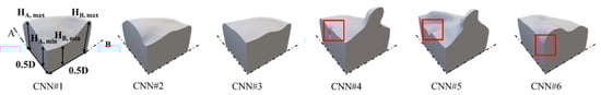 The piston head geometry was input to the trained CNN sub-models and the derived preform shapes are shown in Figure 18 and Table 5. The derived preform shapes were utilized in the 3D thermo-mechanical FEM simulations, as described in Appendix B. As for the industrial manufacturing process, the preforming stage can prevent die failure by reducing the die wear depth, which is significantly related to the forging load. Therefore, for the piston head verification step, the die wear depth according to the preform shapes was also estimated by the FEM investigations. Regarding the preform shapes derived by CNNs #4, #5, and #6, some features were considered too complicated to be obtained during a preform-forging phase, resulting in folding defects during the piston-forging phase, as highlighted in Figure 18. Therefore, these three candidates were excluded from further investigation.
