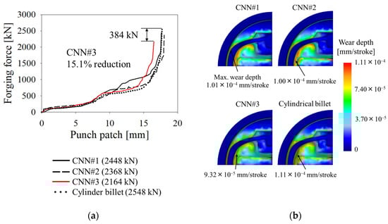 (a) Forging force–punch patch curves and (b) die wear distribution for CNN#1, CNN#2, CNN#3, and cylindrical billet preforms, respectively.