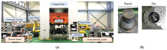 Based on the positive results obtained from the FEM investigation in Figure 19a, two experiments were performed considering the CNN#3 preform design and the cylindrical billet. For the hot forging process, the HKLP-800 press machine shown in Figure 20a was utilized, and the set-up conditions for the process summarized in Appendix B were utilized in the 3D FEM simulations. The top and bottom dies, relevant for the piston head shape, are shown in Figure 20b.