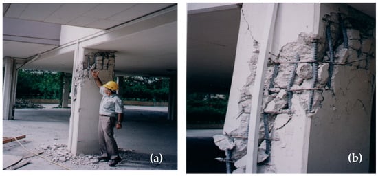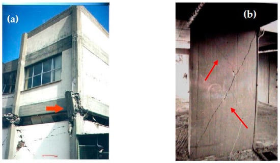 During the last decades, alternative retrofitting techniques were developed aiming to provide practical solutions to the in situ RC jacketing difficulties for the various RC structural elements [14,15,16,17,18,19,20,21]. Obviously, apart from the structural elements themselves, the more difficult regions for effectively retrofitting an existing RC structure are the critical areas of the structural member connections (joints) as well as the connections with the foundation. Both, the structural connections and the foundation are very critical areas that require special consideration in both identifying the nature of the probable structural damage as well as proposing countermeasures. The main flexural structural damage in slabs and beams develops in the areas of maximum bending moments. For the beams, this usually develops near the joints with the columns and shear walls where large bending moments are expected to arise due to the seismic loads. Similarly, at the ends of the beams are areas of large shear forces from the combination of earthquake forces with the dead and live loads; these will cause the appearance of shear damage in the form of diagonal cracks. The presence of large bending moments mainly from the seismic loads together with large axial forces will cause the formation of flexural damage at the top and the toe of columns, whereas the presence of shear forces from the seismic loads together with axial forces will lead to the formation of shear damage at the columns, a very dangerous form of damage (see Figure 2a,b). The presence of large shear forces from seismic loads, together with relatively low-level axial forces, will lead to the development of another dangerous form of shear damage in the shear walls (see Figure 3b), whereas the presence of short columns will lead to the development of large shear forces from seismic loads and the development again of shear damage, as shown in Figure 3a.