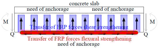 This study focuses on the specific problem of RC T-beams which are under-designed in shear. This is a relatively common problem that is due to outdated seismic code provisions with relatively low seismic force levels used in the past, which resulted in relatively low shear force demands for such RC beams in multi-story RC buildings. According to such an outdated seismic design, the shear demands for T-beams were resulting from the combinations including dead and live load and they were met by relatively light transverse reinforcing with open hoop steel stirrups. Instead, current seismic codes result in much larger shear force demands than before at regions where such beams join the columns. In addition, they require that the transverse reinforcement consists of closed hoop steel stirrups. Therefore, it is necessary to strengthen such under-designed RC T-beams deficient in shear capacity. Figure 1b depicts a retrofitting scheme whereby such shear capacity upgrade is carried out by constructing an RC jacket employing extra closed hoop stirrups narrowly spaced. Such a scheme is relatively difficult because it requires the partial breaking of the slab in order to place the closed hoop stirrups and then cast the RC jacket. A relatively simple alternative is to try to attach externally, on the web of such RC T-beam, strips of fiber-reinforced polymers (FRP) in the form of stirrups bonding them to the concrete surface with special epoxy resins. However, even in this case, the main difficulty is to try to add closed hoop FRP stirrups. A large number of experimental investigations were performed with rectangular beam specimens which did not include the slab. In this case, the absence of the slab allows the externally attached FRP strips to have the form of closed hoop stirrups. However, in the vast majority of multistory RC buildings, the slabs are cast in unison with the supporting beams, thus forming typical T-beam structural elements; this does not allow easy passing of such FRP strips in order to form the closed hoop stirrups that are required in order to bring the shear capacity to meet the demands posed by the upgraded seismic design. It was demonstrated that applying open hoop FRP strips, thus avoiding confrontation with breaking the slab, leads to limited shear upgrade because these open hoop FRP stirrups suffer from premature debonding, thus being completely neutralized [35,36,37]. This is presented and discussed in Section 2, Section 3 and Section 4. In Figure 4 an RC T-beam is shown schematically provided with external FRP reinforcement in order to increase its flexural and shear capacity. The positive bending moment capacity increase, as shown in Figure 4, is enhanced by FRP strips bonded at the bottom side of this T-beam with an FRP strip of one or multiple layers (indicated with red color) having as width the width of the bottom side of this T-beam. For negative bending moment capacity increase, the FRP strip should be bonded alternatively at the top side of this T-beam. In this case, this becomes relatively easy because the FRP strip width can be much wider than that bonded at the bottom side. This externally bonded CFRP strip will function in the same way as the internal longitudinal steel reinforcement developing tensile axial forces. The shear capacity is similarly enhanced by the transverse shear FRP open hoop strips (indicated with blue color) bonded externally; they will also develop axial forces resisting in this way the shear force demand after the formation of the diagonal shear cracks through the concrete volume. They will function in the same way as steel shear reinforcement placed internally in the form of steel stirrups.