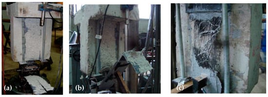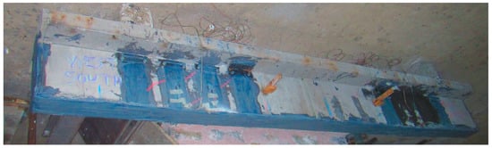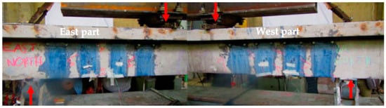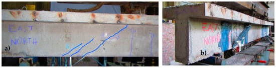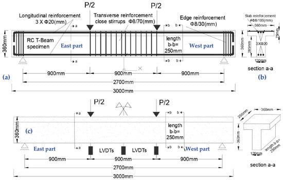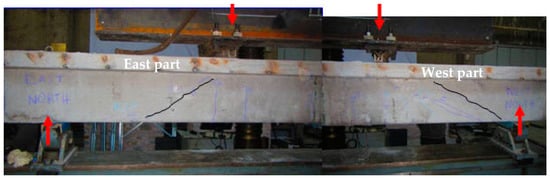 - At this virgin stage, the prototype RC T-beam, having its east and west parts intentionally deficient in shear, was loaded prior to any shear retrofitting (Figure 5c) until the appearance of diagonal cracks, indicating that the shear capacity limit state was reached.