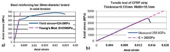 Finally, there are two regions between the supports and the central region that are left without any internal shear reinforcement in terms of steel stirrups (east and west parts). These two regions develop under the employed loading large shear demands. Therefore, it is expected that because of this intentional shear deficiency the prototype RC T-beam in its virgin state will fail in shear in these regions. In this way, in the initial loading stage, this represents the initial control stage whereby the shear resistance is provided only by the concrete volume. Next, during three distinct loading stages corresponding to three distinct retrofitting schemes (see Section 2.2), these regions are provided with an externally applied specific shear reinforcing scheme. Each of these three distinct retrofitting schemes employs either open hoop or equivalent closed hoop FRP strips; the measured shear capacity during each of these three distinct retrofitting stages is compared to the corresponding capacity of the control virgin stage. In this way, the ability of each retrofit to upgrade the shear resistance is demonstrated. The results of the observed performance of this prototype RC T-beam, without or with a shear strength upgrade, are presented in Section 4. The prototype RC T-beam as well as the “unit T-beams”, described in Section 2.1, were built with the same concrete (the concrete compressive strength is listed in Table 1), reinforcing bars (typical tensile test shown in Figure 6a), and carbon FRP strips (typical tensile test shown in Figure 6b). From a series of laboratory tests, the compressive strength of the concrete was found equal to fck = 19.94 MPa, the yield and ultimate strength of the longitudinal reinforcing bars were found equal to 524.6 MPa and 683 MPa, whereas the ultimate strain of the CFRP material was found equal to 0.015 for Young’s modulus approximately equal to 260 GPa which is in agreement with the value given by the manufacturers.