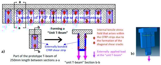 (a) Force transfer mechanisms for externally bonded CFRP strips for shear retrofit and the concept of forming a “unit T-beam” specimen. (b) Three-dimensional drawing of a limited length unit “T-beam” specimen including a single CFRP strip external transverse shear reinforcement with a steel anchoring device together with the externally applied load.