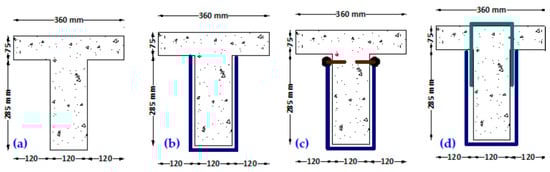 In order to check the ability of such equivalent closed hoop stirrup schemes to upgrade the shear capacity RC T-beam structural elements, specimens of prototype dimensions are constructed and tested in the laboratory. These specimens are deliberately designed to be deficient in shear from the beginning, as is shown by the reinforcing details in Figure 5a,b. Figure 5c depicts the way such a specimen is supported and loaded with a loading arrangement known as four-point flexure, whereby the load is gradually increased monotonically until each specimen reaches its limit state. As can be seen in Figure 5a–c, such a “prototype RC T-beam” specimen is provided with sufficient top and bottom longitudinal steel reinforcement (three reinforcing steel bars of 20 mm diameter each) to provide considerable flexural capacity. In terms of geometry, support conditions, loading and longitudinal, or transverse reinforcing this prototype T-beam is symmetric along a vertical axis going through its mid-span. Three distinct regions can be seen along the specimen’s length with respect to its shear reinforcement. At the very far left and right ends, the transverse reinforcement consists of narrow spaced (every 15 mm) steel close hoop stirrups of 8mm diameter. This is done in order to prohibit any shear failure at these regions hosting the supports as well as to provide sufficient confinement in order to enhance the bond strength of the longitudinal reinforcement in this region. Next, there is a 900 mm long central region where the steel close hoop stirrups of 8 mm diameter are spaced every 70 mm. This central region of the specimen is not required to resist any shear because of the employed loading; however, the used stirrups can enhance the flexural capacity by providing confinement to the compressive zone as well as prohibiting, up to a degree, of the buckling of the longitudinal reinforcement at the compressive tope zone because of the development of large bending moments at this region.