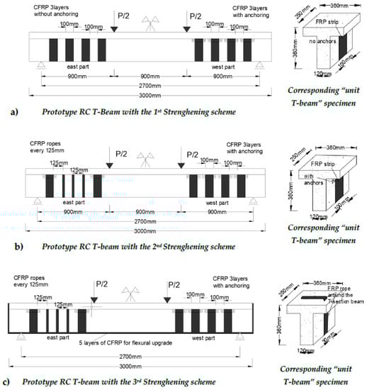 In what follows, the measured response of the tested prototype RC T-beam during the four distinct stages of sequentially applying is described in Section 2.2. CFRP strip shear retrofitting schemes are presented and discussed.