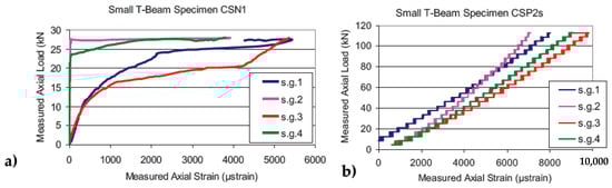 In what follows, the measured response obtained from two distinct sequences of tests employing “unit T-beam” specimens with various types of CFRP stirrups, with or without anchoring, is presented and discussed. Figure 11a,b depict the measured response in terms of applied total tensile load versus the strain readings that developed at the locations of the four strain gauges shown in Figure 9a–c. Figure 11a depicts a typical plot of the measured response for the CFRP strips without any anchoring (Figure 8b and Figure 9a), whereas, Figure 11b is the corresponding typical response for the CFRP strips that are provided with steel anchors in addition to bonding at the sides of the “unit T-beam” specimens (Figure 8c and Figure 9b).