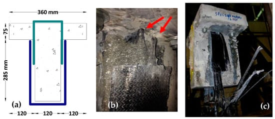 Before testing the simple-supported prototype RC T-beam depicted in Figure 5a–c without or with CFRP external transverse shear reinforcement, a simple experimental procedure was conceived in order to study the force transfer mechanisms that develop in this external CFRP strip transverse shear reinforcement and the concrete volume. For this purpose, T-beam specimens were constructed of relatively small length having the same cross-section as the prototype T-beam of full length (Figure 5b). The length of these specimens, denoted as “unit T-beams”, was equal to 250 mm, which was sufficient to provide the necessary bond surface to house a CFRP external transverse shear reinforcing strip having a width of approximately 100 mm, as shown in Figure 7a,b (see also Figure 10a–c).
