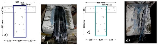 In order to have a direct measurement of the tensile capacity of either the CFRP strips themselves or the CFRP anchor ropes when in position, extra “unit T-beam” specimens were constructed whereby the CFRP strip (specimens ref-1 and ref-2, Figure 14a,b) and the CFRP rope (specimens SWFX No1, No2 and No3, Figure 14c,d) were accommodated in a closed hoop formation and were subjected to the same loading arrangement depicted in Figure 9c. The obtained results are listed in Table 4.