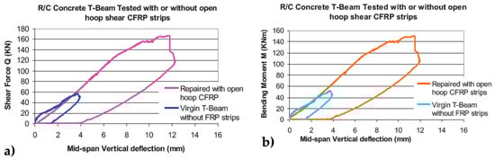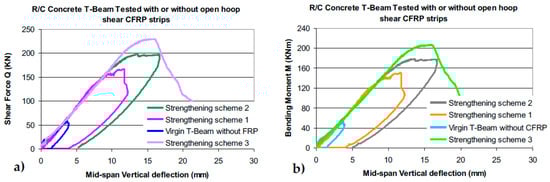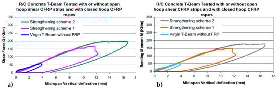The limit state this time (1st shear strengthening scheme, Figure 16) resulted, as expected, in the debonding mode of failure of the East side unanchored CFRP strips as shown in Figure 17b for a shear force equal to 166.77 kN. The corresponding maximum bending moment value is equal to 150.09 kNm. This shear force value is more than three times larger than the shear capacity measured for the un-strengthened virgin T-beam. The variation of the applied shear force versus the vertical deflection of the virgin and the strengthening with this 1st shear strengthening scheme T-beam is depicted in Figure 18a, whereas, Figure 18b depicts the comparison of the measured bending moment response between the Virgin T-beam and the T-beam having been retrofitted with the 1st strengthening scheme (a-Shear force versus the deflection at mid-span, b-Bending moment versus the deflection at mid-span). A comparison of the modes of failure after the maximum load was reached is depicted in Figure 17a for the virgin T-beam without any external shear CFRP strips (development of diagonal shear cracks), and in Figure 17b for the T-beam retrofitted according to the 1st shear strengthening scheme. As can be seen in Figure 17b, the limit state, in this case, was the debonding of the open hoop CFRP strips without anchoring. It is important to underline that the West part of this T-beam, although subjected to the same shear force level as the East part, did not show signs of any distress. This is due to the presence of the effective anchors that accompanied the open hoop CFRP strips at this location. The design of this CFRP anchoring scheme was facilitated by specially designed software [47] as well as valid numerical simulations [51].