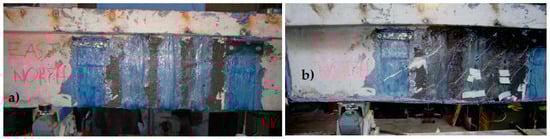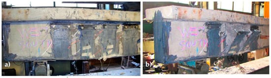 - At this 2nd stage, the 1st shear strengthening scheme was applied by employing the external application of open hoop CFRP strips. At the West part, four (4) 3-layer open hoop CFRP strips were employed (Figure 10a) having 0.131 mm thickness, 100 mm width, and spaced at 200 mm intervals measured from their centerline. These West part CFRP strips employed the anchor scheme of Figure 8c and Figure 9b. At the East part, four (4) 3-layer open hoop CFRP strips were employed again, the same as at the west part of the T-beam, however, without any anchors (Figure 8b and Figure 9a). Each CFRP strip layer was 0.131 mm thick and 100 mm wide and were spaced at 200 mm intervals measured from their centerline, as were the CFRP strips at the East part. This was carried out in order to study the debonding mode of failure for the CFRP strips attached to this part. As will be discussed in Section 4, the limit state, in this case, was the debonding of the unanchored CFRP strips of the East part.