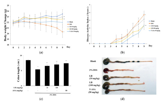 The effect of LB on clinical signs of UC in DSS-induced mice. The mice were administered with 3% DSS to induce UC, then LB and 5-ASA were given to treat UC clinical signs. (a) Body weight change; (b) disease activity index score; (c) colon length; (d) photograph of the colon. Values are represented as the mean ± S.D. The data were analyzed by Bonferroni’s post-hoc test. * p < 0.05 versus Blank group and ** p < 0.05 versus DSS group.