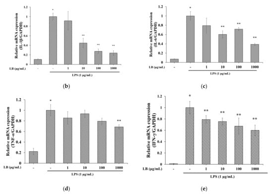 To determine (a) cell viability, an MTT assay was used. LB (1, 10, 100, or 1000 μg/mL) did not show cytotoxicity in the peritoneal mouse macrophages. In LPS-stimulated peritoneal mouse macrophages, the LB treatments reduced the mRNA levels of (b) IL-1β, (c) IL-6, (d) TNF-α, and (e) IFN-γ. Values are represented as the mean ± S.D. The data were analyzed by Bonferroni’s post-hoc test. * p < 0.05 versus normal group and ** p < 0.05 versus LPS stimulation-only group.