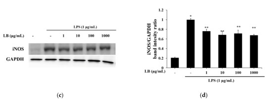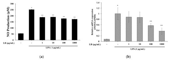 NO production increased when peritoneal mouse macrophages were stimulated with 1 μg/mL of LPS compared to the non-treatment group (non-treatment group, 54.99 ± 1.05 μM; 1 μg/mL LPS treatment group, 252.04 ± 2.51 μM). LB treatment decreased NO production, especially 1000 μg/mL of LB, which significantly reduced it (1 μg/mL LPS treatment group, 252.04 ± 2.51 μM; 1000 μg/mL LB treatment, 172.89 ± 2.34 μM) (Figure 6a). The LB treatment regulated the mRNA level of iNOS in LPS-stimulated peritoneal mouse macrophages, and attenuated the protein expression of iNOS (Figure 6c). This result suggests that LB has an anti-inflammatory effect on macrophages.
