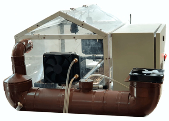 To maintain the proper conditions in the sesame seeds germination process, VPD and soil moisture must be controlled. According to the research presented by [33], the adequate VPD values for any crop range from 0.5–1.4 kPa. The VPD is dependent on temperature and relative humidity. In an investigation presented by [34,35], it was mentioned that the variables for sesame seeds should be maintained between 25 and 37 °C for temperature, close to 100% for relative humidity and at a value between 80 and 95% for soil moisture. Based on these requirements, a micro-greenhouse was designed and built (Figure 1). The dimensions of the micro-greenhouse presented in millimeters and the location of the systems for temperature and humidity can be observed in Figure 2. The systems used for temperature control in this research require the energy transfer between two fluids (Figure 3). Two heat exchangers were installed, one for heating and one for cooling. Water temperature for heating was maintained at 45–50 °C by applying an on–off control. Water temperature for cooling was obtained directly from the local supply network, ranging between 21 and 25 °C. To control relative humidity, a water vapor saturation system was installed. This system works with air flow using a fan in a tubular tank with water and a submersible water pump.