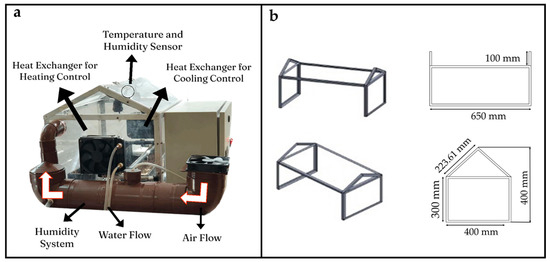 Components (a) and dimensions (mm) (b) of the micro-greenhouse.