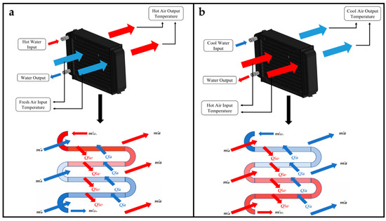 Schematic of heat exchangers for heating (a) and cooling (b).