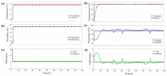 Simulation (a–c) and implementation (d–f) graphs of temperature FL control, humidity NN control and VPD control.