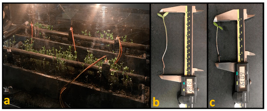 In the micro-greenhouse, the longest sprout measured 137.82 mm, as shown in Figure 7b, while the sprout obtained with the longest length using the traditional technique measured 60.79 mm, as can be observed in Figure 7c. The sprout with the longest length presented in the micro-greenhouse grew 77.03 mm more than the sprout obtained with the traditional technique. This is due to the controlled conditions of temperature and soil moisture, and seedling growth is favored by keeping these variables at optimum values. However, in the traditional technique, temperature ranged from 25 to 30 °C. In terms of soil moisture, saturation occurred in the soil and after a few hours of water scarcity, which caused the seedling development to be limited by the oxygen obstruction to the seed and crest hardening.