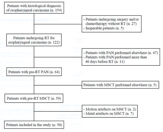 From January 2010 to December 2020, all patients (n°154) with a histological diagnosis of oropharyngeal squamous cell carcinoma undergoing RT (with or without chemotherapy) at the Careggi University Hospital (Florence, Italy) were selected. Of the originally enrolled sample, 27 patients who had undergone surgery and/or chemotherapy without RT and 5 patients who had received palliation were excluded. A further 58 patients were also excluded due to the lack of PAN prior to the start of RT, since PAN had been performed in other institutions or more than 40 days before treatment. Then, 5 patients were excluded because they had performed pre-RT MSCT elsewhere. Finally, 2 and 7 patients were excluded due to the presence of motion and metal artefacts that significantly degraded the quality of pre-RT MSCT images (Figure 1).
