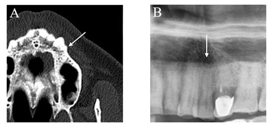 An example of false-positive apical periodontitis. (A) Upper jaw MSCT imaging. No periapical bone lesion was detected (arrow). (B) In PAN, at the level of the periapex of the root of the left first premolar, the observers noted a radiolucent periapical image (arrow) characterised by supposed changes in bone structure that simulated an apical periodontitis lesion.