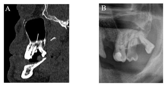 An example of false-negative apical periodontitis. (B) Upper jaw MSCT imaging showing apical periodontitis affecting the left second molar. (A) In PAN, no periapical bone lesion was detected at the level of the periapex of the left second molar.