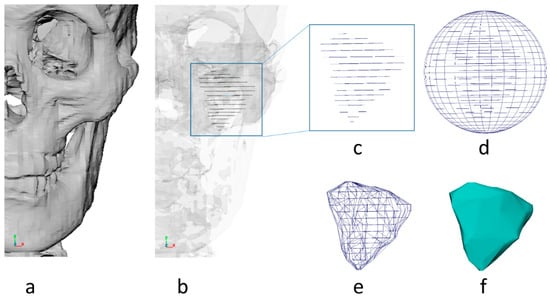 Surface reconstruction of a lateral pterygoid muscle and skull. The lateral pterygoid muscle and skull were initially surface reconstructed (a). The skull is transparent to reveal the initial surface models of the lateral pterygoid muscles (b). The initial surface models of the lateral pterygoid muscles (c). A polyhedron was made (d) and formed around the initial surface models of the lateral pterygoid (e). Then, the surface model of the lateral pterygoid was realistically and smoothly reconstructed (f). (Maya, version 2022, www.autodesk.com, accessed on 28 August 2021).