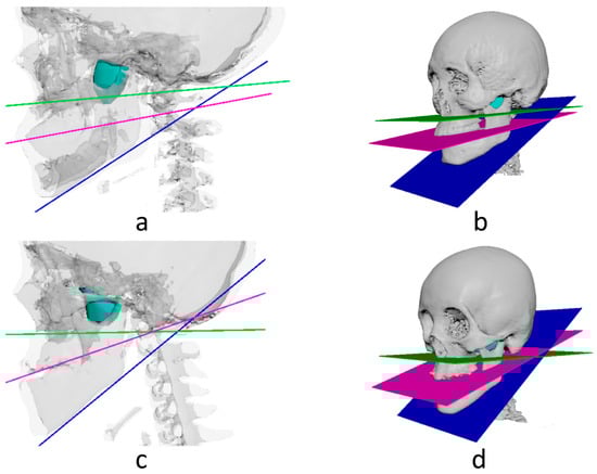 The values between the lateral pterygoid muscle and 3 reference planes were calculated three-dimensionally using surface planes. The surface planes of the palatal (green), occlusal (violet), and mandibular planes (blue) were organized based on cranial shape. Lateral pterygoid and 3 reference planes for (a) sagittal view and (b) directional view of the normal group and (c) sagittal view and (d) directional view of the prognathic group (Maya, version 2022, autodesk.com, accessed on 28 August 2021).