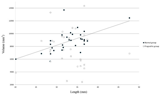 Distribution of lateral pterygoid volume/length ratios of prognathic and normal groups. Black and white points show normal and prognathic groups’ volume/length data, respectively. Blue dotted line represents trend line. Individuals of prognathic group are mainly located underneath trend line, while those in normal group are mainly located near and over trend line.