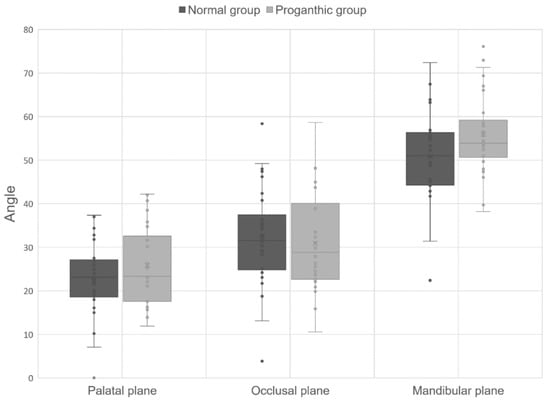 There were significant differences in orientation for the lateral pterygoid and three reference planes between the prognathic and normal groups (Figure 4, Table 2). Although a difference was not surely found in the occlusal plane between the prognathic and normal groups, a significant difference existed between the mandibular and palatal planes of the prognathic group compared to that of the normal group. On the sagittal plane, the independent t-test showed a significantly larger angle between the mandibular plane for the prognathic group (56.0° ± 9.0°) compared to that for the normal group (50.8° ± 10.6°, p < 0.05). A larger angle was also observed between the palatal plane for the prognathic group (25.9° ± 8.8°) than for the normal group (22.4° ± 8.2°, p < 0.05), which reveals that the prognathic group individuals had lower horizontal angles compared to the reference planes.