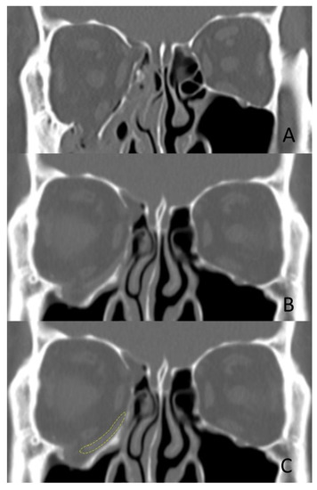 CT of a patient with a 3D-printed standardized implant (group (A)) for a right orbital inferomedial fracture. (A) Preoperative CT. (B) At three months postoperative. (C) The implant outline is indicated by a yellow dotted line.