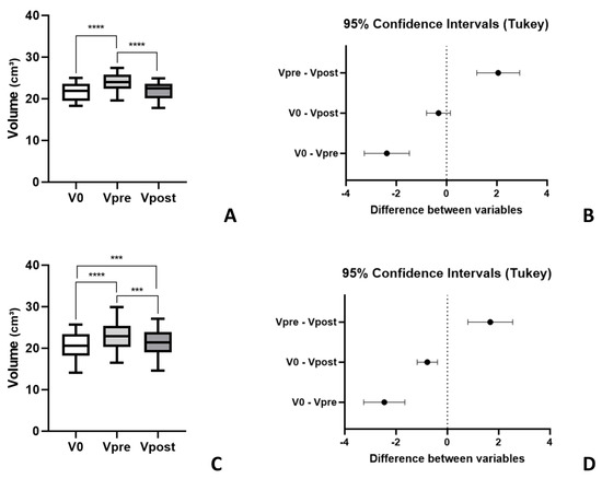 Analysis of orbital volume of the normal side and the preoperative and postoperative lesion sides in computed tomography. (V0: orbital volume of the normal side; Vpre: preoperative orbital volume of the lesion side; Vpost: postop-rative orbital volume of the lesion side). (A) In group (A), according to repeated measures one-way ANOVA, V0 and Vpost were similar, but differences between V0 and Vpre as between Vpre and Vpost were significant (p < 0.05). (B) 95% confidence intervals of group (A) using repeated measures one-way ANOVA. (C) In group (B), according to repeated measures one-way ANOVA, all variables were significantly different (p < 0.05). (D) 95% confidence intervals of group B using repeated measures one-way ANOVA.