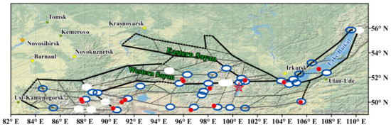 The morphostructural zoning map of the Altai–Sayan–Baikal region. Thick black lines—rank I lineaments; medium gray lines—rank II; thin black lines—rank III; solid lines—longitudinal lineaments; dotted line—transverse ones [36,37], areas prone to earthquakes with M ≥ 6.0 (ellipses with blue boundaries—Barrier-3 [16], white ellipses—Cora-3 [37], white ellipses with blue boundaries—both the algorithms). Red circles designate the epicenters of crustal earthquakes with M ≥ 6.0 (1900–2012) used to form the learning set , red star refers to the epicenter of crustal earthquake (11 January 2021 with M = 6.7) that occurred after the completion of recognition.