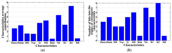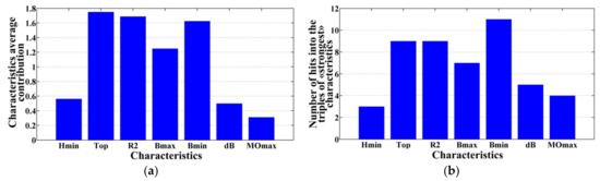 The sorting of , and the selection for each of them of three characteristics with the greatest values, followed by the summation of the number of belongings of such characteristics to the formed threes, enable assessing the contribution of such characteristics through their classification as the “strongest.” This class will be called Top 3 ranking. This explains the name of the algorithm Barrier-3.