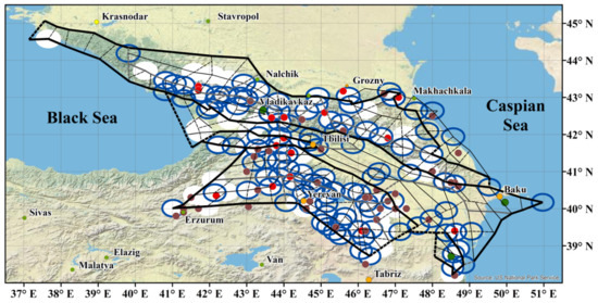 The morphostructural zoning map of the Caucasus (legends as in Figure 2) [40], areas prone to earthquakes with M ≥ 6.0 (ellipses with blue boundaries—Barrier-3 [17], white ellipses—Cora-3 [41], white ellipses with blue boundaries—both algorithms) and the epicenters of earthquakes with M ≥ 6.0 (brown circles—before 1900, red circles—in the period from 1900 to 1992 (used to form the learning set ), dark green circles—since 1993 (material for a pure exam)) [42].