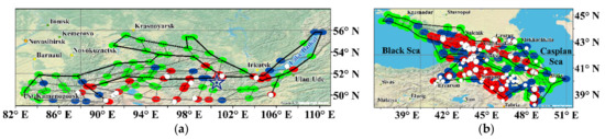 The list of the geological-geophysical and geomorphological characteristics of considered vicinities of lineament intersections used for recognition by Barrier-3 algorithm is given in Table 1. Highlighted in bold type are 7 characteristics that were selected to be used for recognition in the Altai–Sayan–Baikal region based on the findings from the assessment of informativeness for the instance of one learning class; in italics, 11 characteristics selected for recognition in the Caucasus are given. It is noteworthy that 4 characteristics (Hmin, Top, R2, and dB) were selected for recognition using the Barrier-3 algorithm in both regions. Based on the threshold magnitude of the recognized earthquake-prone areas (M ≥ 6.0), the circles with a radius of 25 km were selected as vicinities within which the values of characteristics were computed. For reproducibility of the result and its greater reliability, the values of characteristics of objects were computed automatically using the smart GIS developed by the Geophysical Center of the Russian Academy of Sciences (http://seismgis.gcras.ru/ access date: 30 July 2021) [19,20].