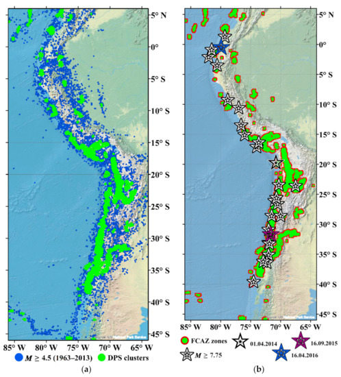 - Gvishiani, A.D.; Zhidkov, M.P.; Soloviev, A.A. Recognition of strong-earthquake-prone areas: X. M 7.75 earthquake prone areas on the Pacific Coast of South America. In Mathematical Models of the Structure of the Earth and the Earthquake Prediction, 14 of Computational Seismology; Keilis-Borok, V.I., Ed.; Allerton: New York, NY, USA, 1983; pp. 56–68. [Google Scholar]