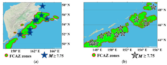 - Dzeboev, B.A.; Agayan, S.M.; Zharkikh, Y.I.; Krasnoperov, R.I.; Barykina, Y.V. Strongest Earthquake-Prone Areas in Kamchatka. Izv. Phys. Solid Earth 2018, 54, 284–291. [Google Scholar] [CrossRef]